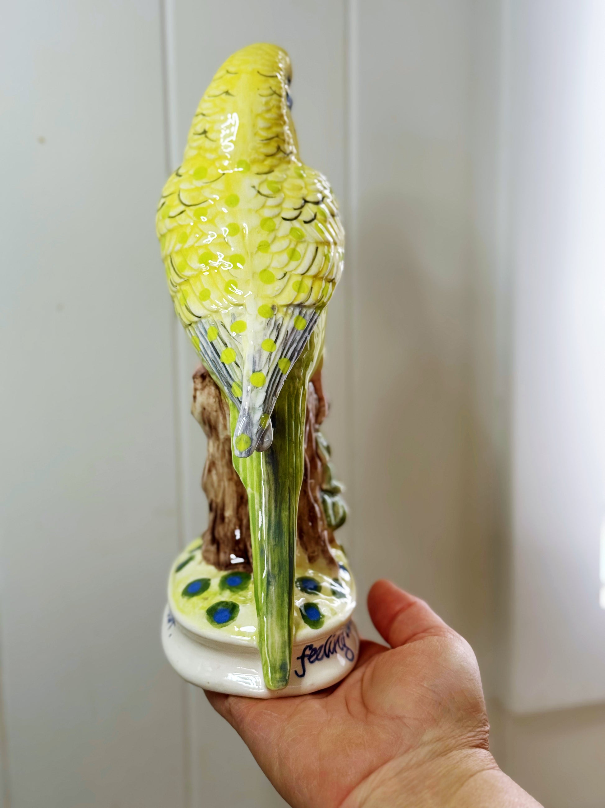 Gorgeous budgie statue with the words ‘Feeling cute, might shit on your head later” handpainted in cobalt on base by Ruth.