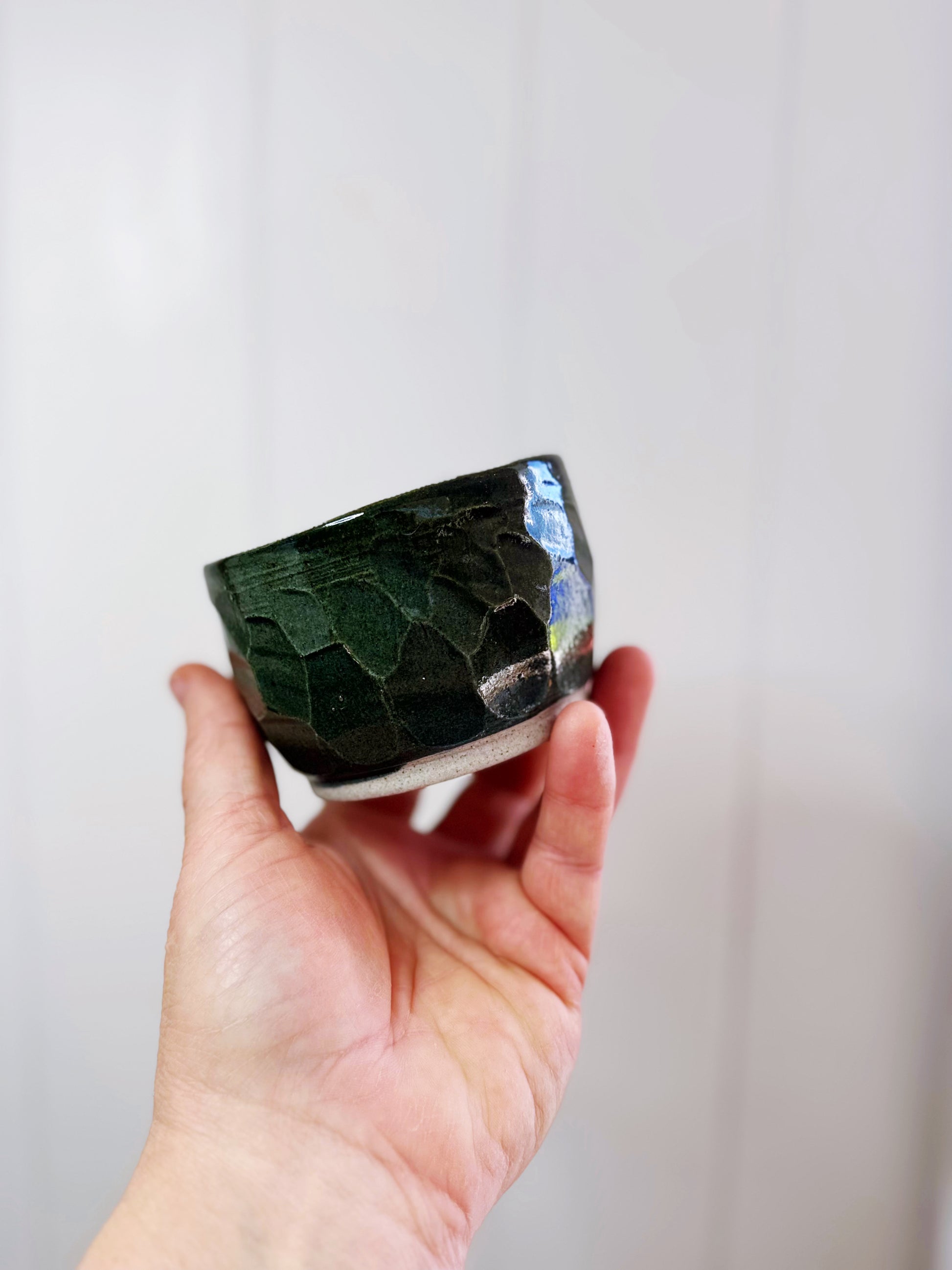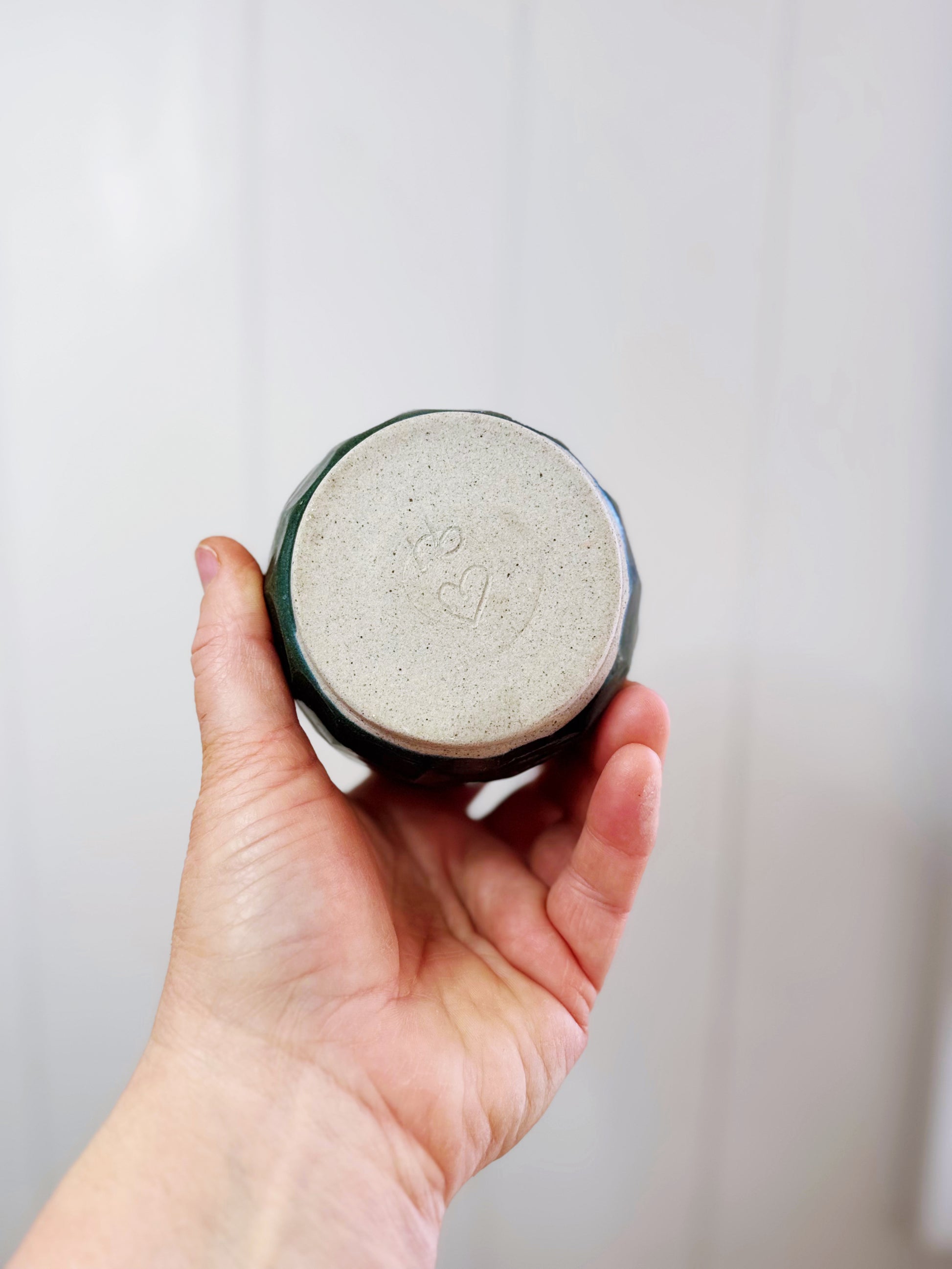 Limited edition Green faceted stoneware coffee bowls. These Coffee Bowls are hand thrown stoneware. Thrown on the potters wheel and then glazed with Ruth’s own glaze. These bowls can be comfortably held in one hand or with both hands wrapped around to keep your hands toasty warm on a cold morning. Each coffee bowl holds about 250ml of liquid and is Stoneware fired. The vessels are DW, OVEN & MICROWAVE safe. As they are handmade, each vessel is similar yet they are all unique & have their own quirks. They can be used for all manner of things- not just for serving Coffee!