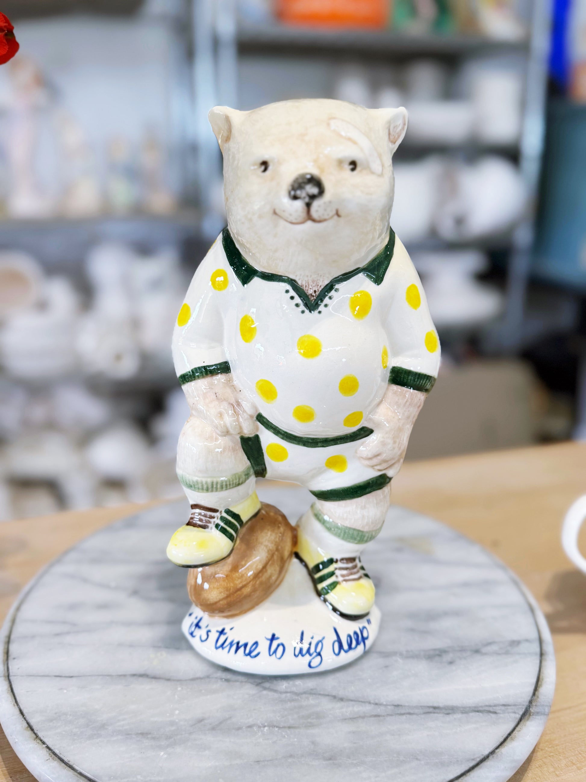 ”It’s time to Dig Deep” said Sir Walter Wombat is handpainted in cobalt on the base.