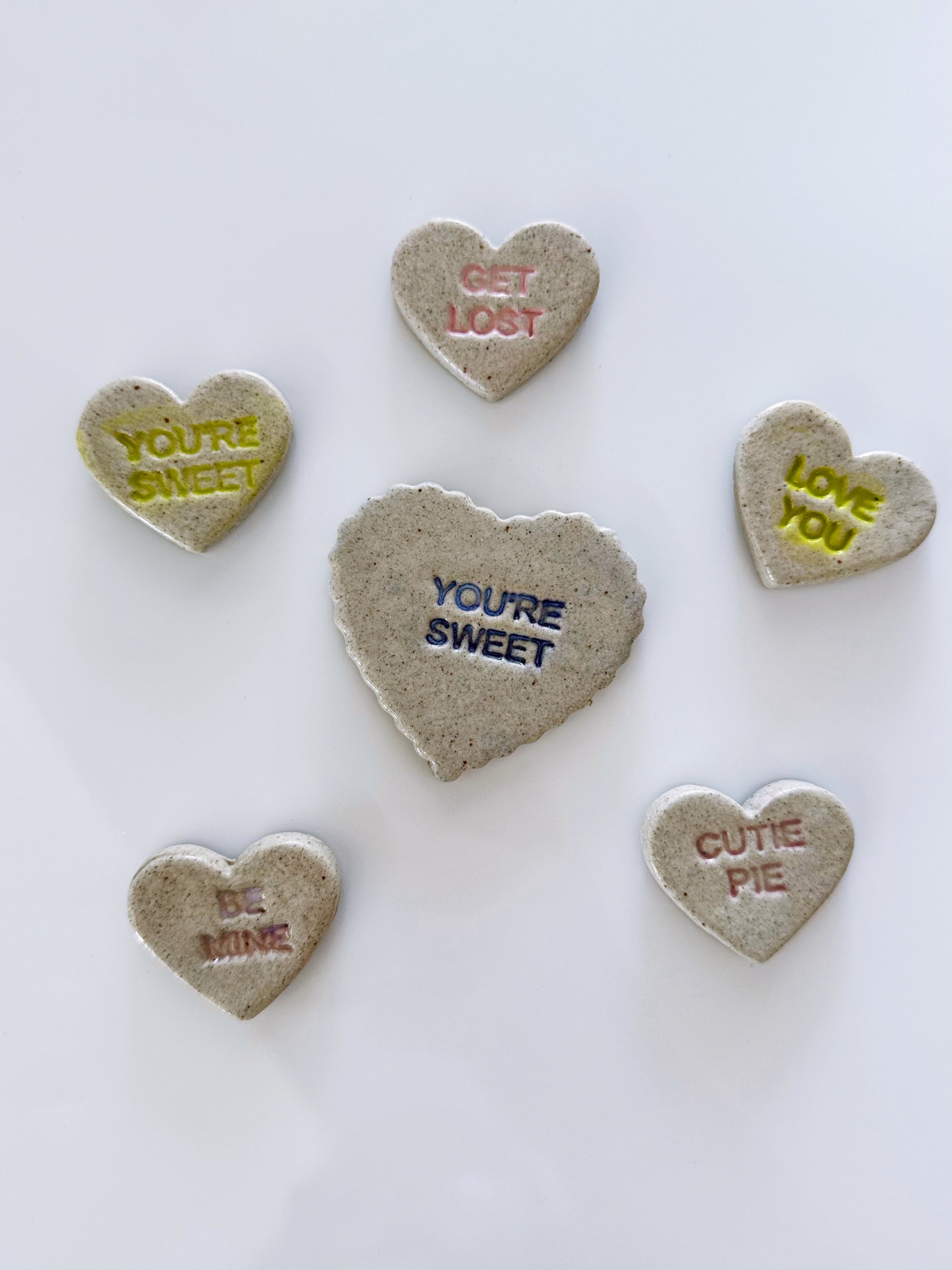 Hand made stoneware love heart magnets with sweet nothings printed onto them.