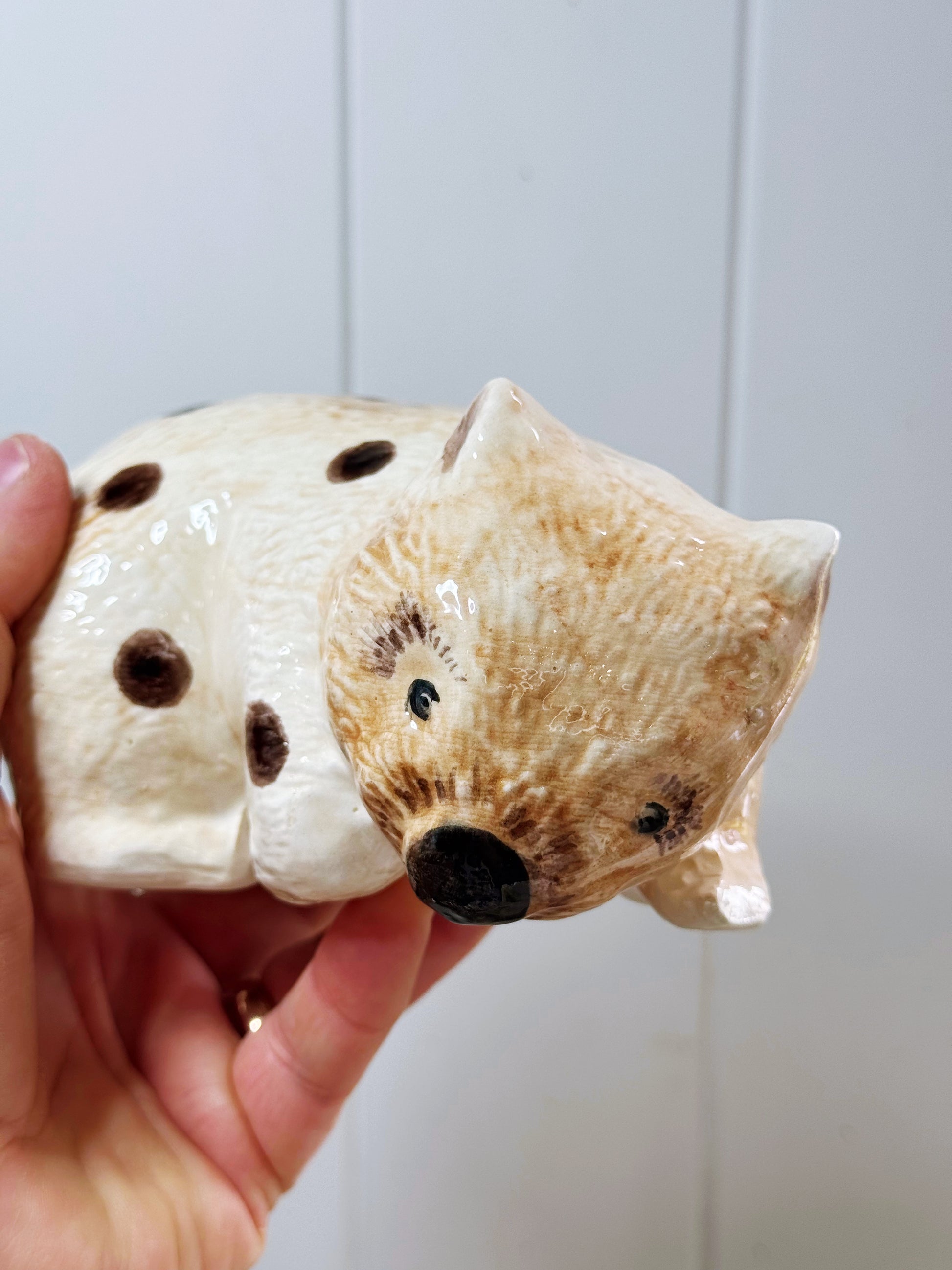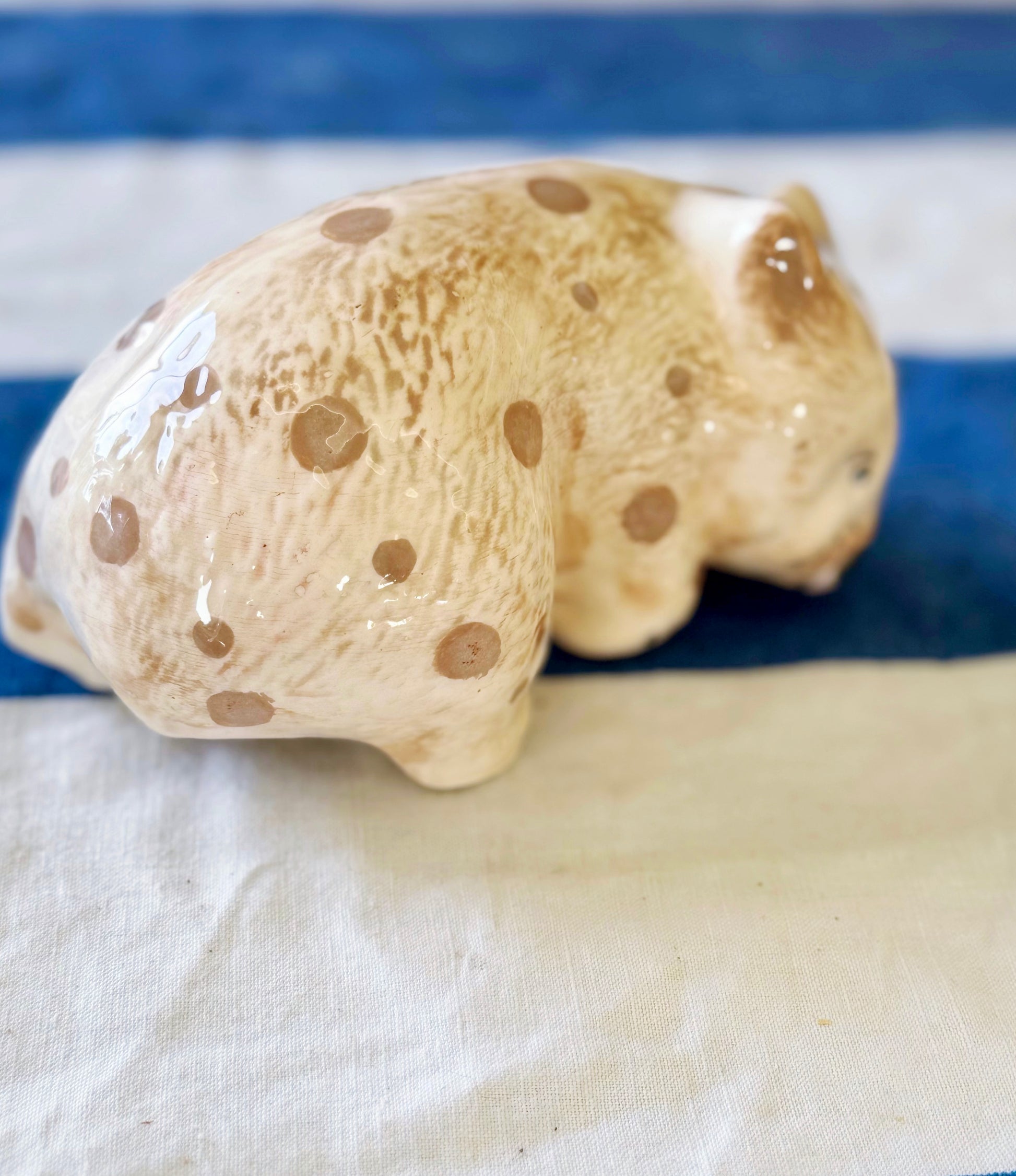Slipcast and hand painted Wombat with the addition of cheeky words and Ruth’s signature slipware polka dots.